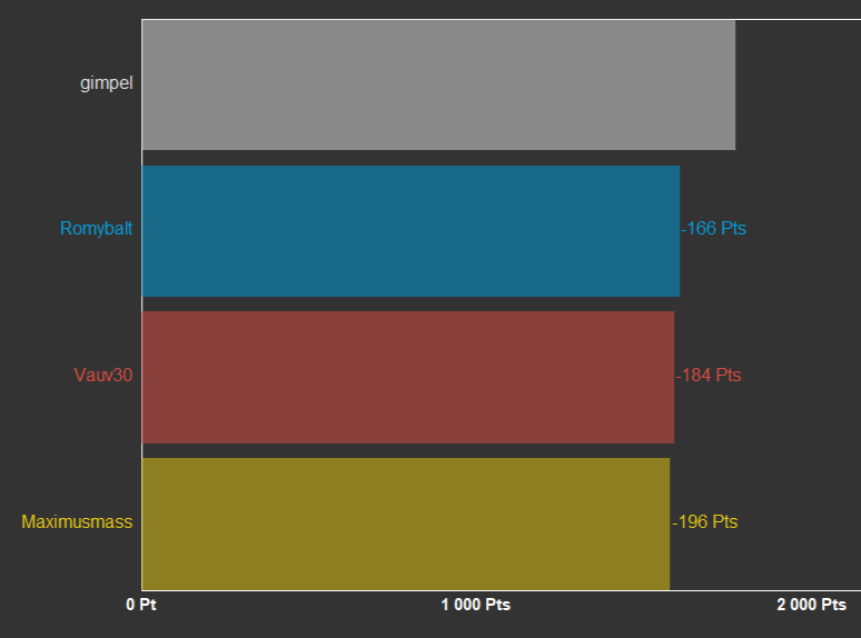 In the dynamic dataviz below, the progression in terms of points for 4 players. The 4 players are number 1 in the final ranking (gray colors), me (yellow color), and my 2 friends (blue and red colors). Participants in places 2, 3 and 4 have next to their bar, the number of points behind 1st position.
